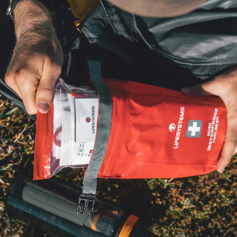 Mini Waterproof First Aid Kit består af en vandtæt TPU-taske med press-seal og rullelukning, D-ringe til fastgørelse og en ekstra indvendig LokTop-pose, der holder udstyret 100% tørt.